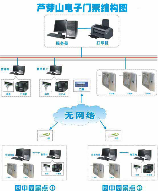 功能需求      芦芽山景区群由6个景区组成,每个景区之间没有网络,要实现统一售票 。